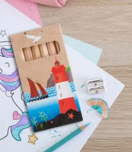 Etui aus Kraftkarton oder weißem FSC-Karton für 6 Buntstifte.