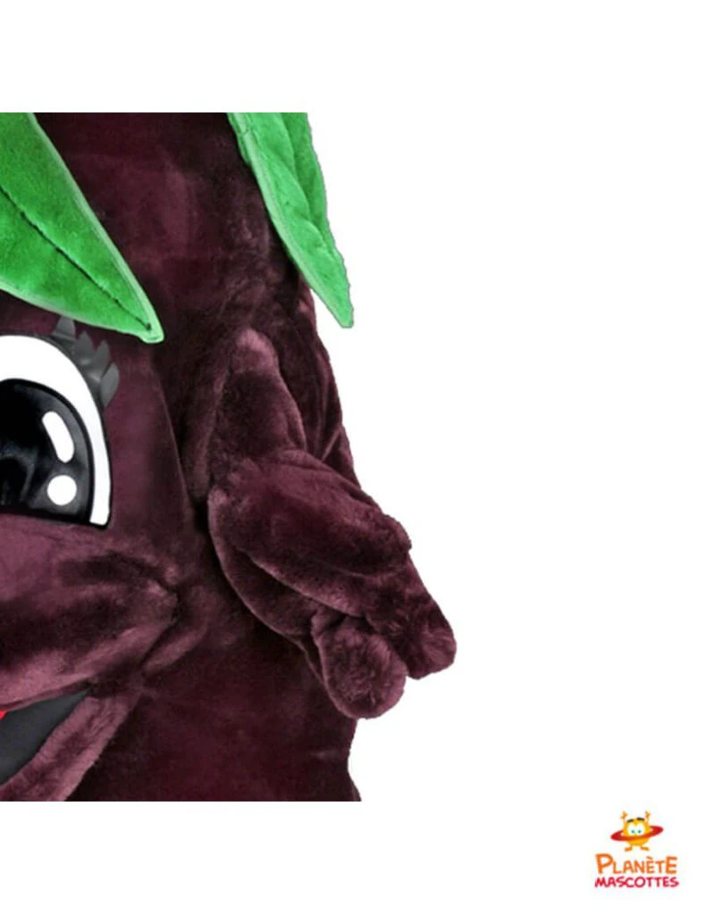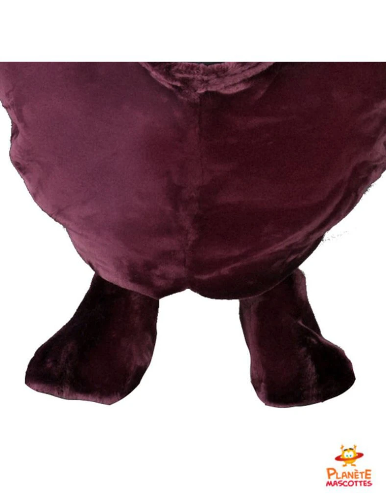 Mascota disponible en talla única (1,6 m – 1,9 m). El disfraz de color berenjena está confeccionado con un tejido suave que se puede lavar a máquina.