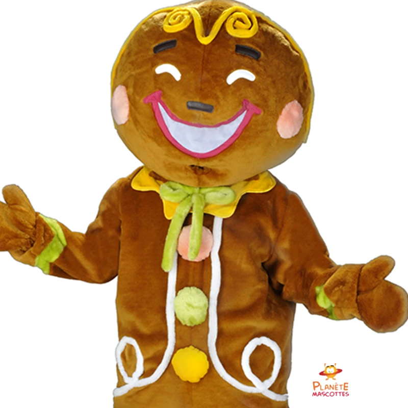 Disfraz de mascota de pan de jengibre para tus eventos temáticos de pastelería y repostería. Disfraz profesional fabricado en Francia que cumple las normas CE y REACH.