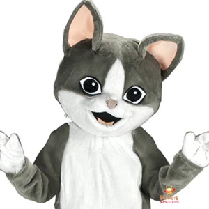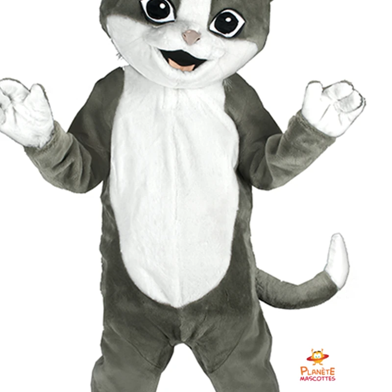 Disfraces de gato gris gigante ypeluches para tus eventos y actividades profesionales. Disfraz de mascota fabricado en Francia según las normas CE y REACH.