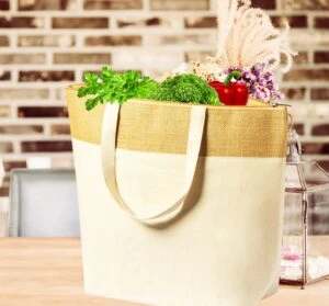 Bolsa térmica fabricada en resistente algodón 100% de 225 g/m2, con parte superior de yute laminado y asas de algodón. Compartimento principal con cremallera y asa metálica, con interior aislante de aluminio. Acabado cosido, con asas medianas reforzadas y resistencia de hasta 7 kg de peso.