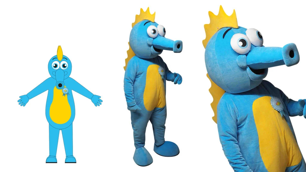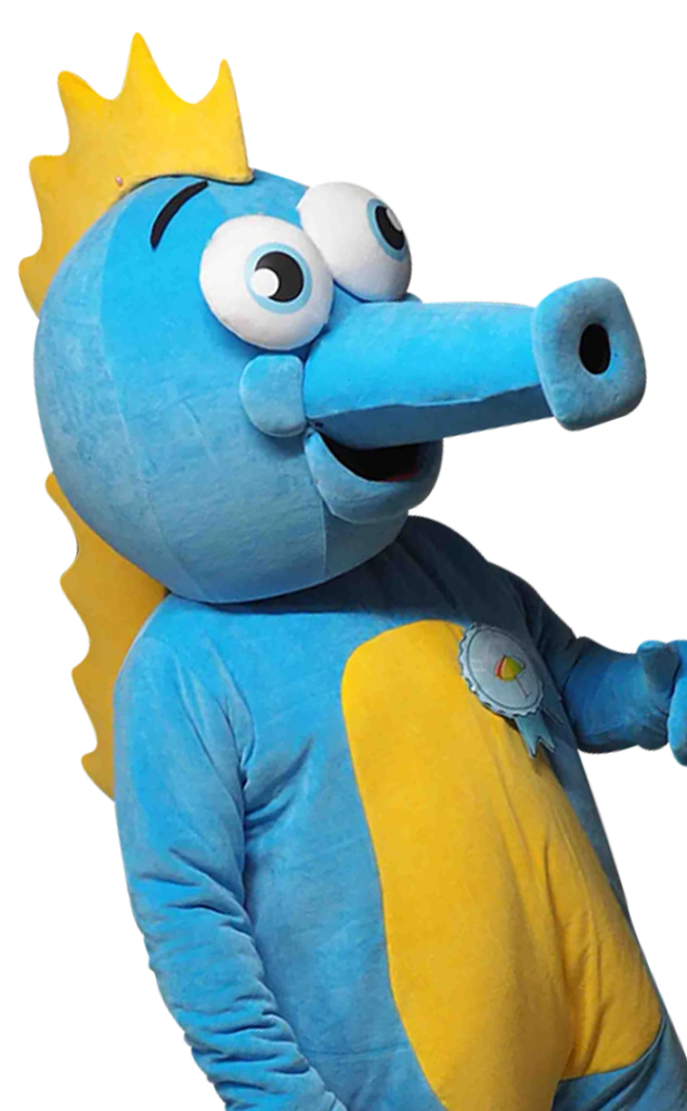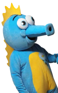 La mascotte hippocampe du camping La Plage nage avec douceur et bonne humeur, offrant aux vacanciers des moments de détente et de fun au bord de l’eau !