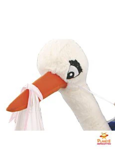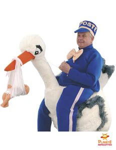Ce déguisement à dos de cigogne peut nous rappeler certaines histoires de notre enfance. Elle illustre ici une fameuse légende comme quoi les cigognes transportent les bébés.