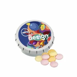 Boîte Clic Clac Ø 45 mm avec garniture menthe sans sucre ou fruits rouges. Encres comestibles pour l‘impression sur les bonbons conformément à la réglementation alimentaire européenne.