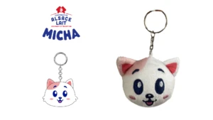 Micha a été imaginé pour refléter l’univers chaleureux et convivial d’Alsace Lait : des formes arrondies, des couleurs fidèles à la marque et des finitions soignées qui transmettent douceur et sympathie. Son porte-clé assorti permet d’emporter ce personnage partout, renforçant le lien entre la marque et ses clients de manière ludique et originale.